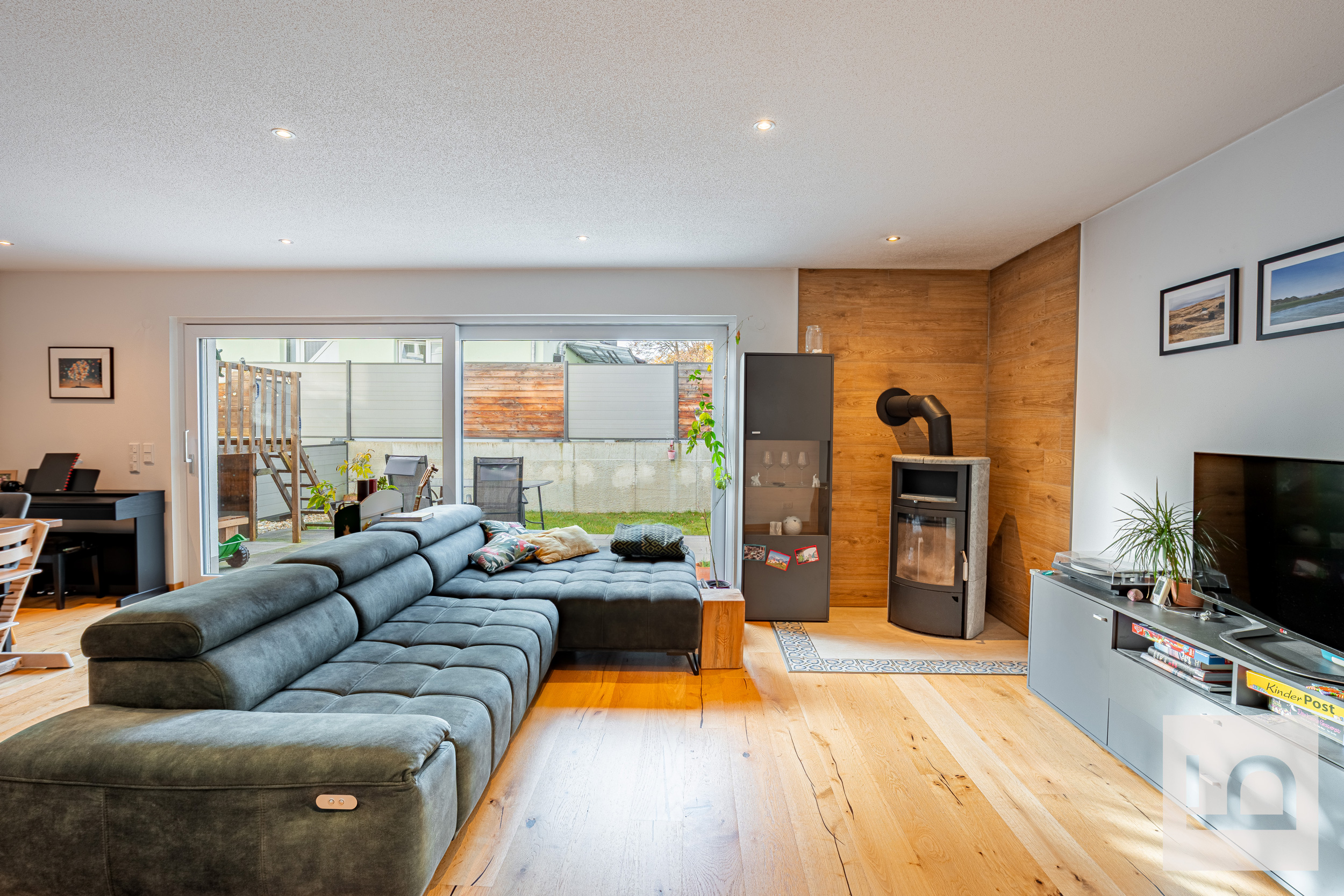 lichtdurchflutete Wohn- und Esszimmer ist wunderbar geräumig und bietet für einen großen Esstisch und eine Wohnlandschaft genug Spielraum. Viel Licht kommt durch die großen Schiebe-Hebetüren, die den direkten Zugang auf die Terrasse und den Garten ermöglichen. Ein Schwedenofen im Wohnbereich sorgt für zusätzliche, wohlige Wärme.