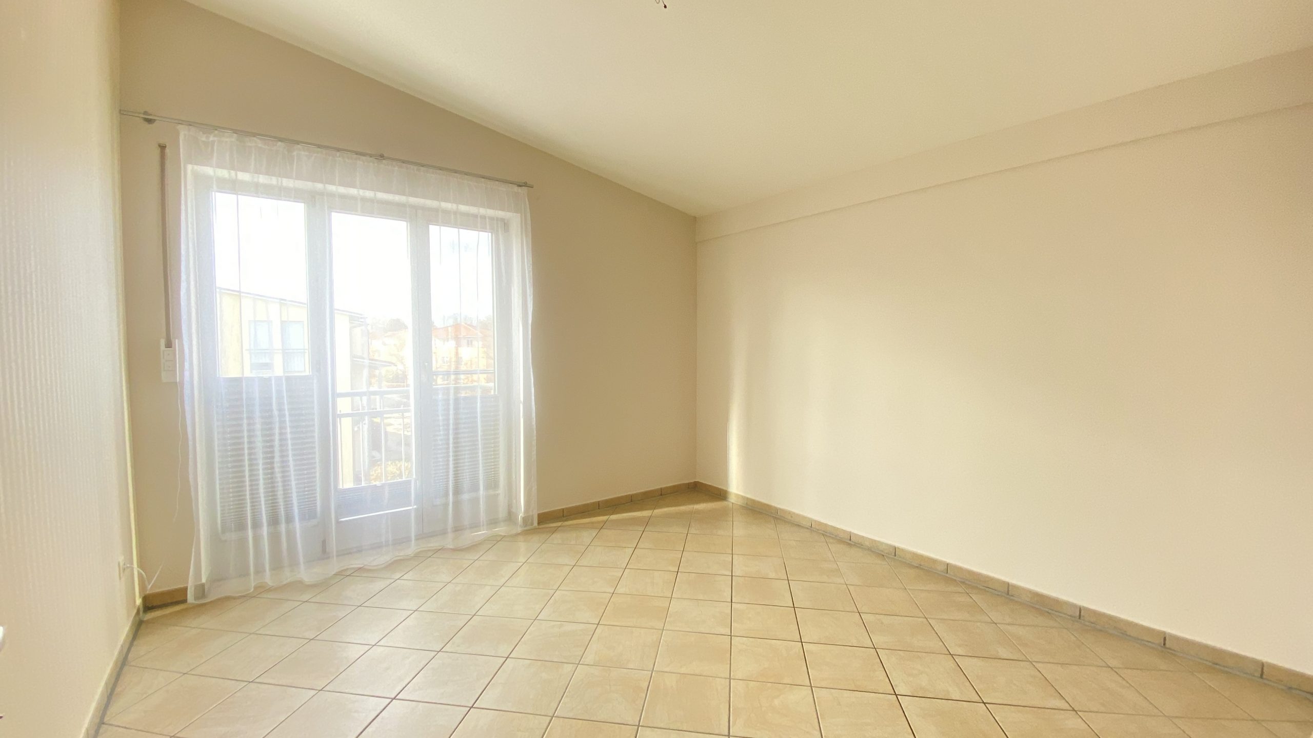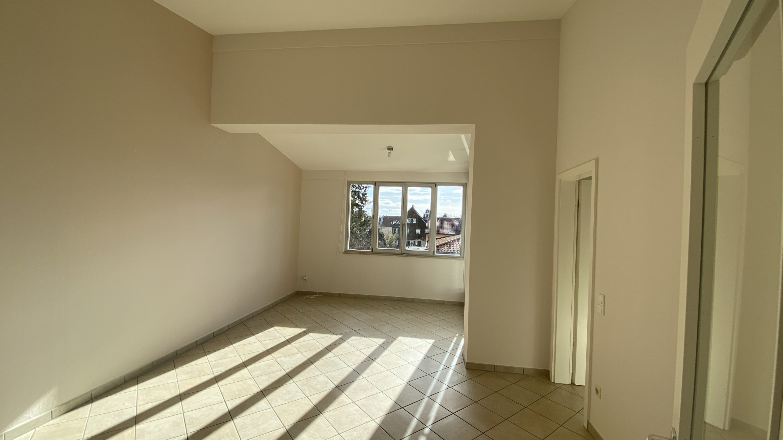 Sonnig – hell – luftig: Diese 3 ZKB fällt aus dem Standard-Raster und bietet viele Pluspunkte: Hohe Räume durch das Pultdach, viele Fenster, Dachterrasse überdacht, tolle Einbauküche, Bad mit Fenster, Wanne und Dusche sowie viel Stauraum durch einen großen Einbauschrank im Flur! Ein